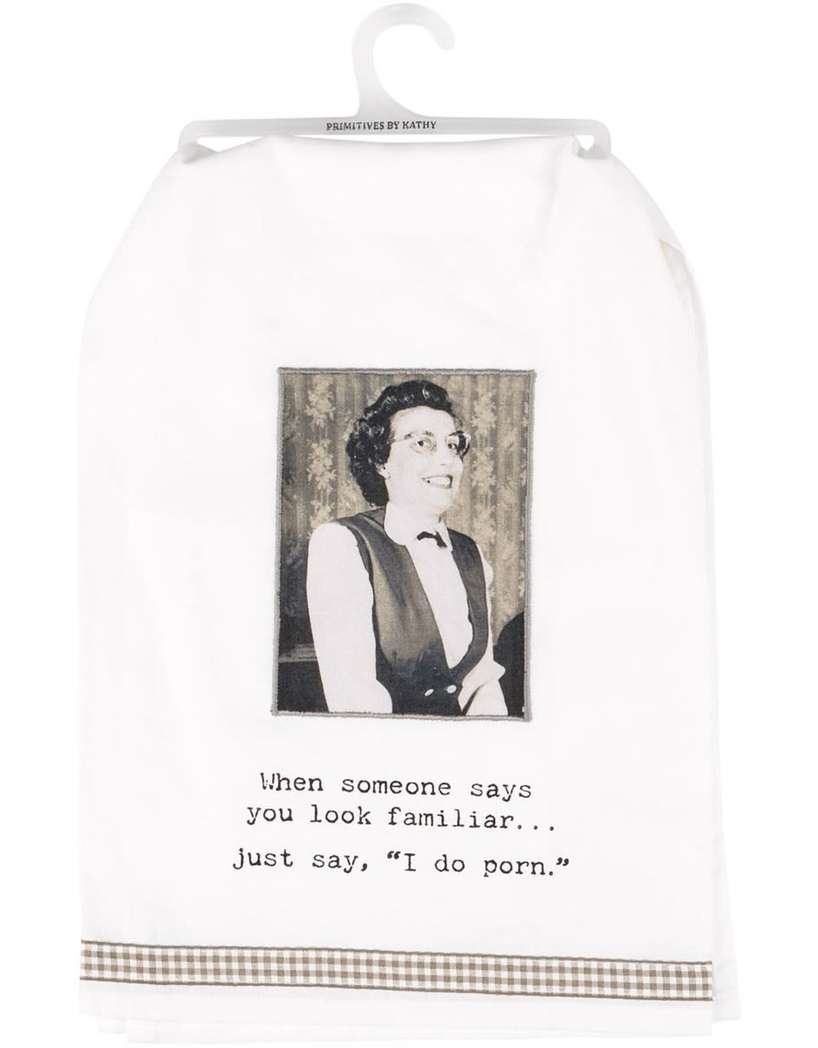A white cotton kitchen towel from our Trash Talk By Annie Collection displaying a vintage photograph on a stitched art panel with grey gingham ribbon and humorous sentiment that reads "When Someone Says You Look Familiar... Just Say, 'I Do Porn.'" Our You Look Familiar kitchen towel is conveniently machine-washable for easy cleaning.